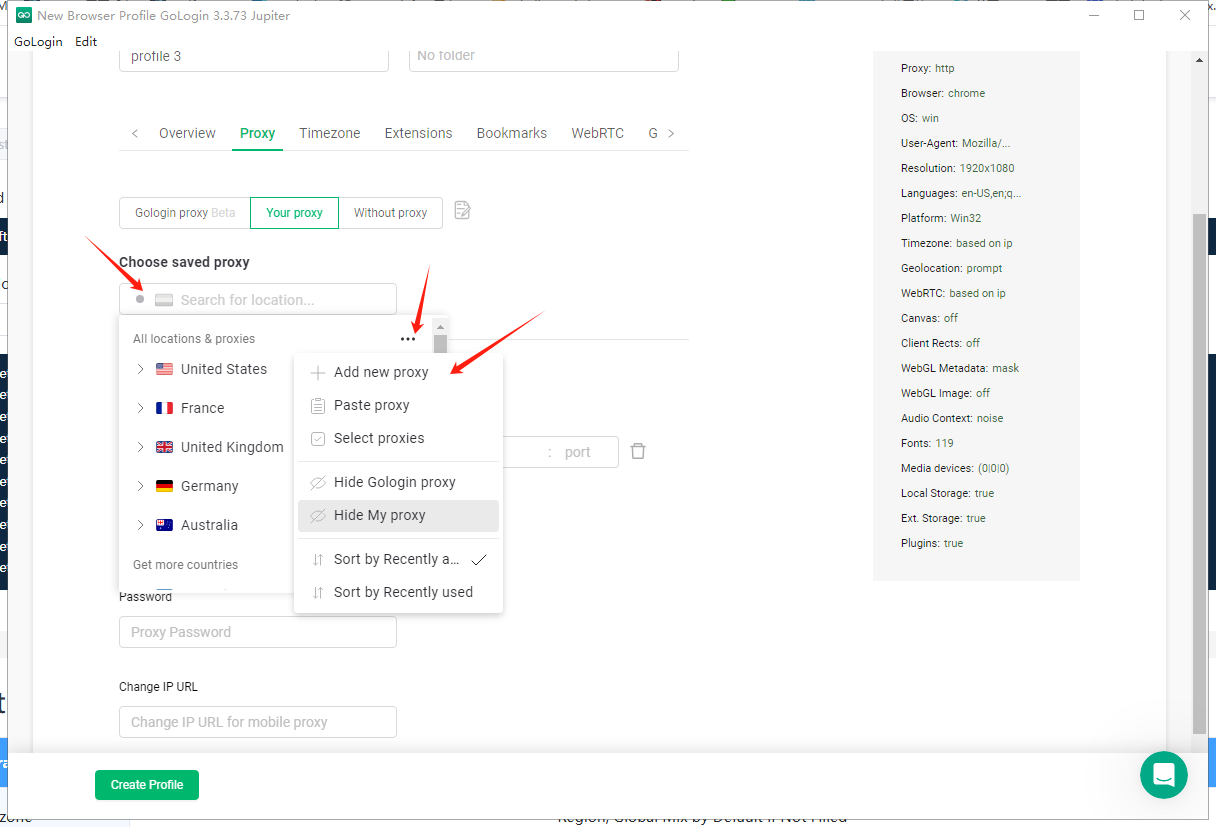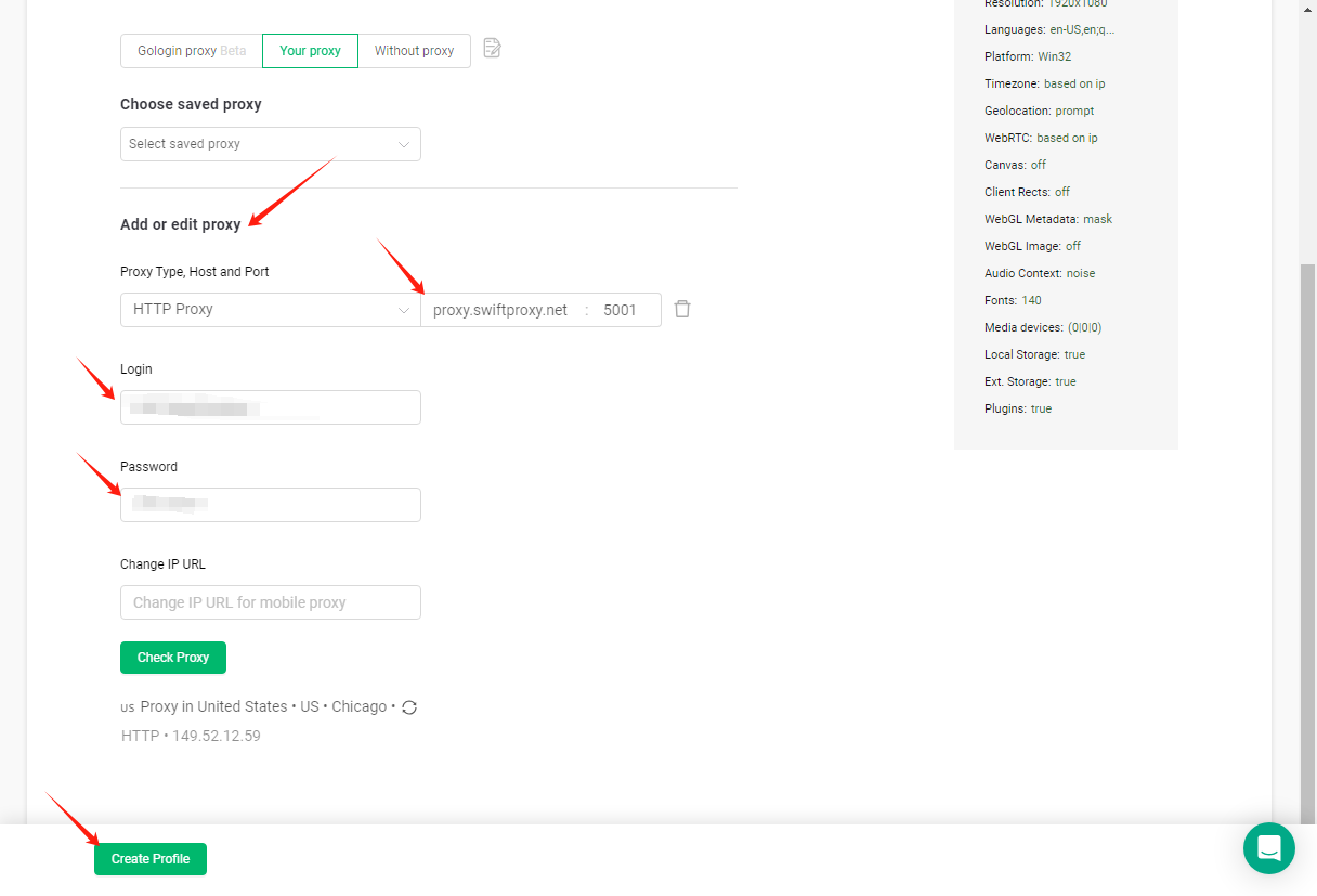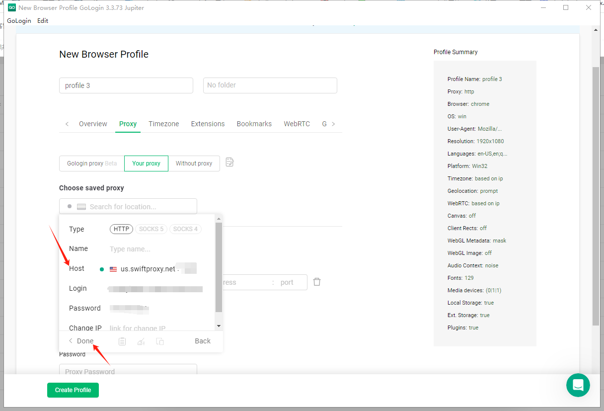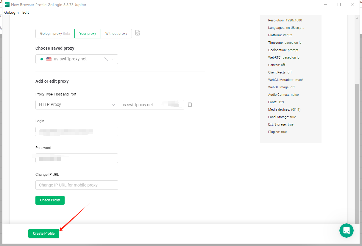 3. Back to Proxy configuration in Gologin, and paste the proxy information we copied from Swiftproxy dashboard, click "Create Profile" in the end.
