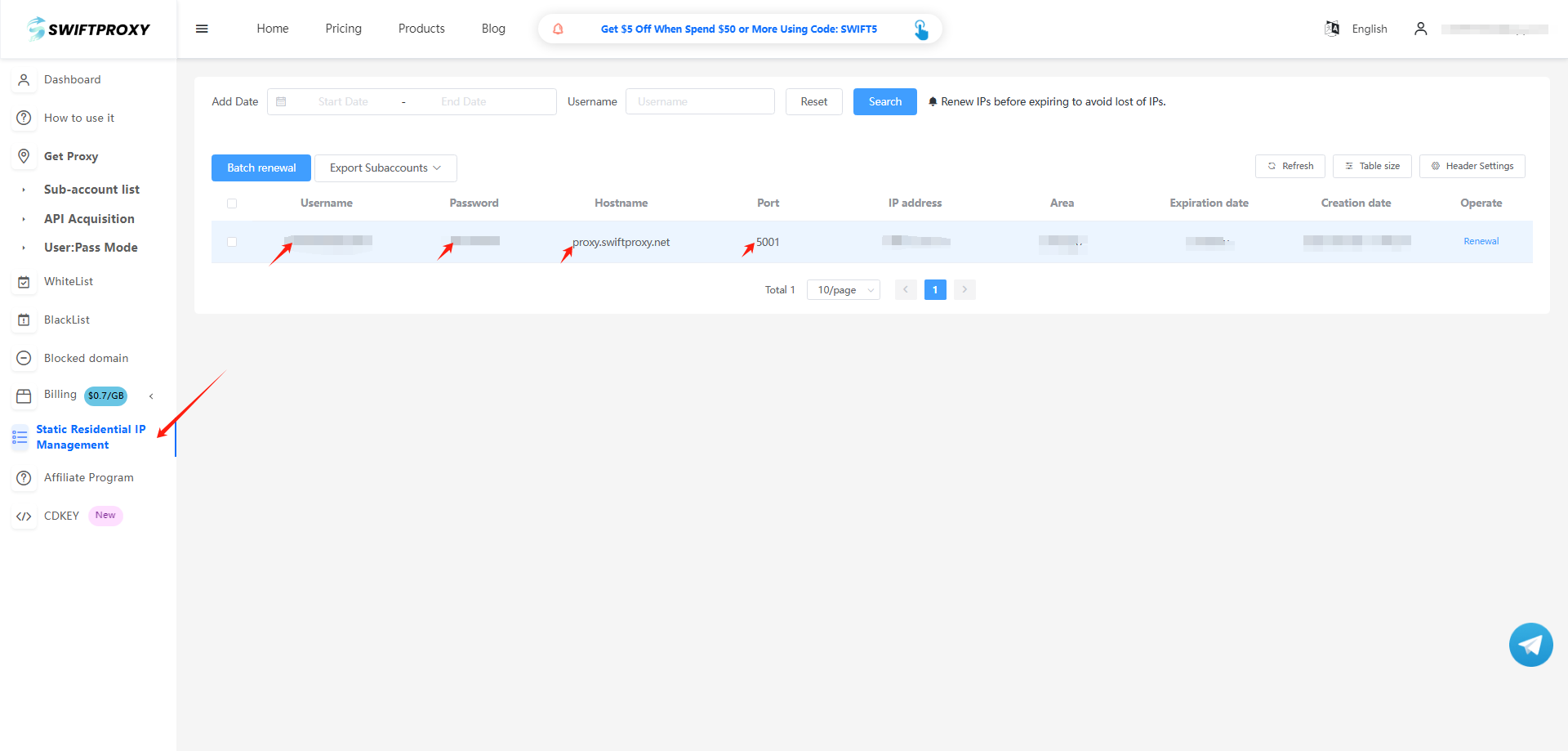 2. Then, visit the Swiftproxy dashboard and copy Username, Password, Hostname and Port.