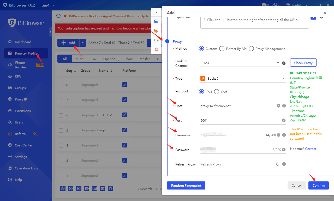 3. 3. Back to Proxy configuration in Bitbrowser, click "Browser Profile", and click "add", scroll down a bit then select the Proxy, and paste the proxy information we copied from Swiftproxy dashboard, click "confirm" in the end.