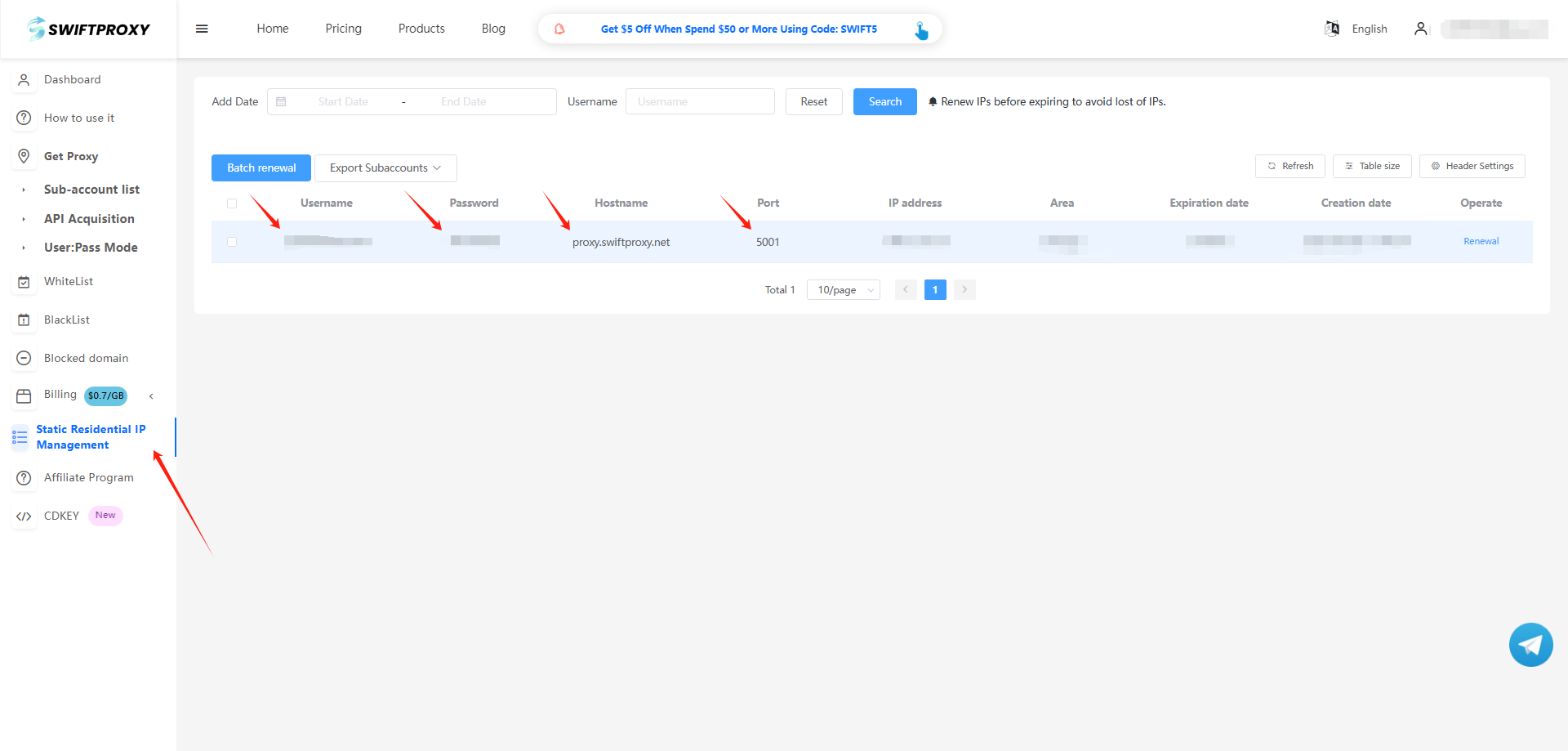 ② For static proxy, copy visit the Swiftproxy dashboard and copy Username, Password, Hostname and Port.