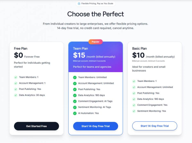 As your needs expand, you can easily upgrade to access multi-account management, advanced analytics, and premium AI features that scale with your growth.