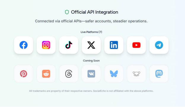 It connects seamlessly with seven major platforms—Facebook, Instagram, X (Twitter), TikTok, YouTube, Telegram, and LinkedIn, through official APIs to ensure a secure and reliable workflow.