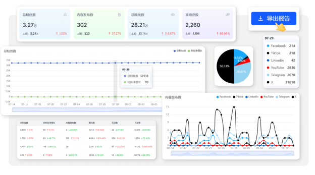 No more blind posting. SocialEcho tracks both your own accounts and competitors in one place. Follower growth, post volume, reach, engagement—all displayed clearly on a single dashboard.