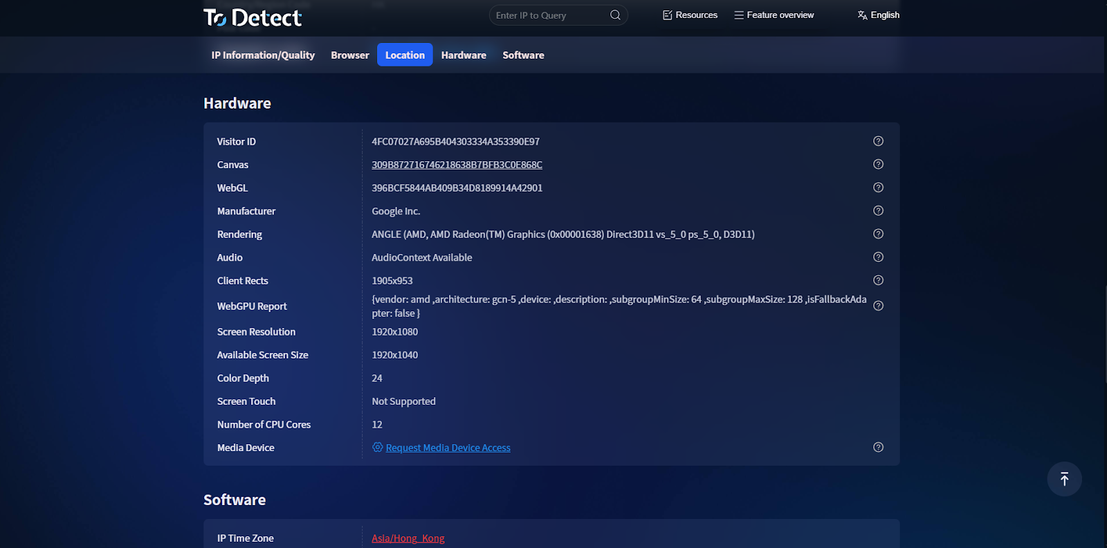 ● ToDetect generates a detailed report covering browser, system, hardware, and network fingerprints.